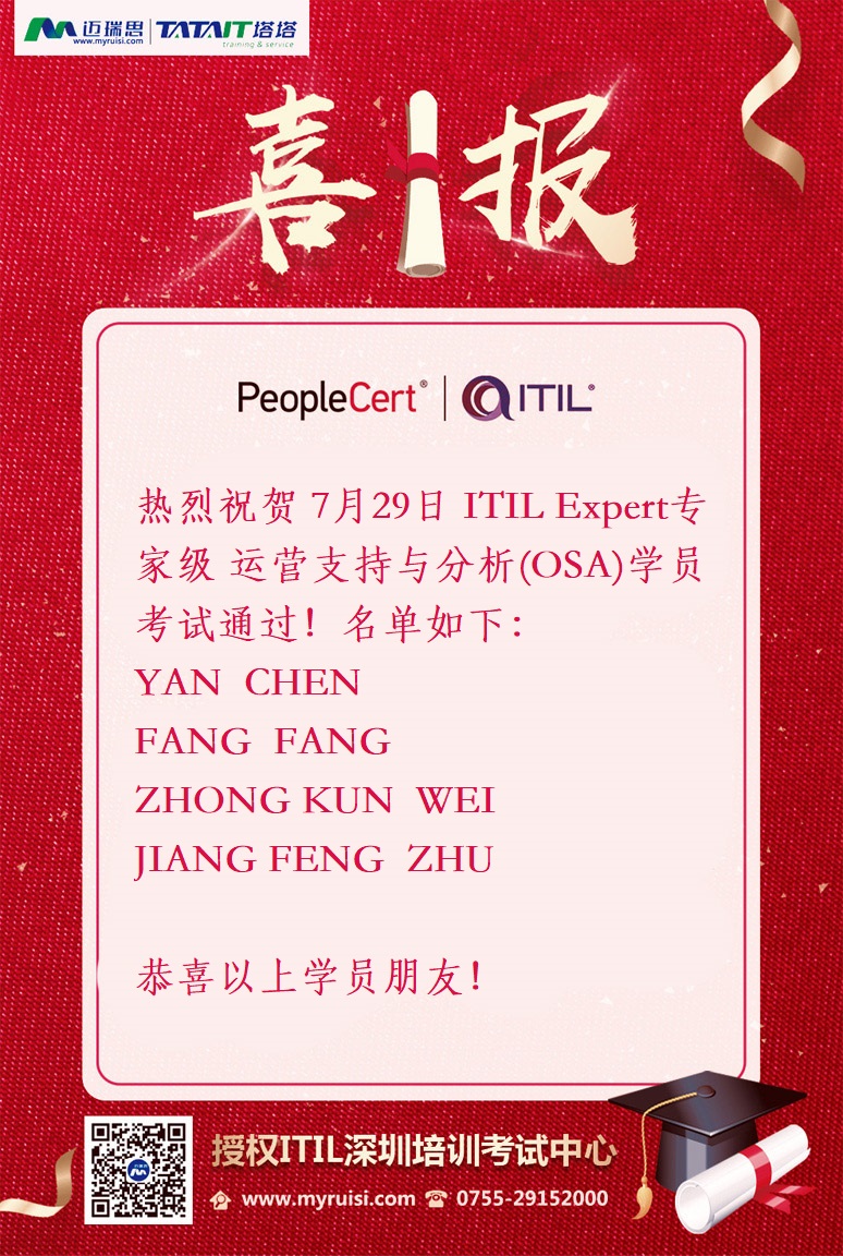 【喜报】7月29 ITIL Expert OSA考试通过喜报 发布时间:2018-08-02 点击数:1619 分享到: 恭喜7月29 ITIL中级 Expert专家级认证 OSA考试通过的学员朋友! 深圳塔塔IT培训, PeopleCert官方授权ITIL培训考试中心。 欢迎来电咨询 0755-29152000 了解更多ITIL中级开课信息 -- 下一篇:【喜报】7月29 Prince2考试通过喜报